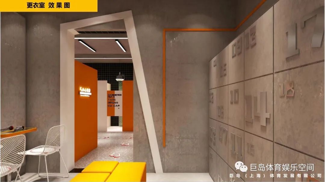 更衣室延续了原始的水泥墙,储物柜做旧,并给柜子的号码加了不同的造型。墙壁做了橙色的简约线条装饰,跟玩乐区主色形成呼应。门框设计成不规则的多边形,富有艺术感。